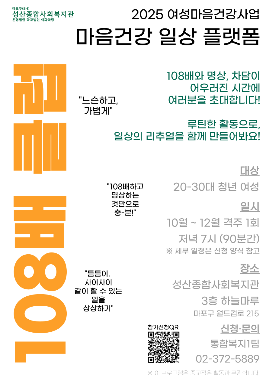 2025년 여성마음건강사업의 일환으로 청년여성 대상 <마음건강 일상 플랫폼 : 108배 클럽> 3차 시기 일정을 시작합니다. 108배를 하고, 명상을 하고, 차담을 나누며 일상의 리추얼을 함께 만들어 봐요.